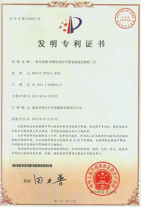 發(fā)明專利證書(一種從廢鈀鈣催化劑...