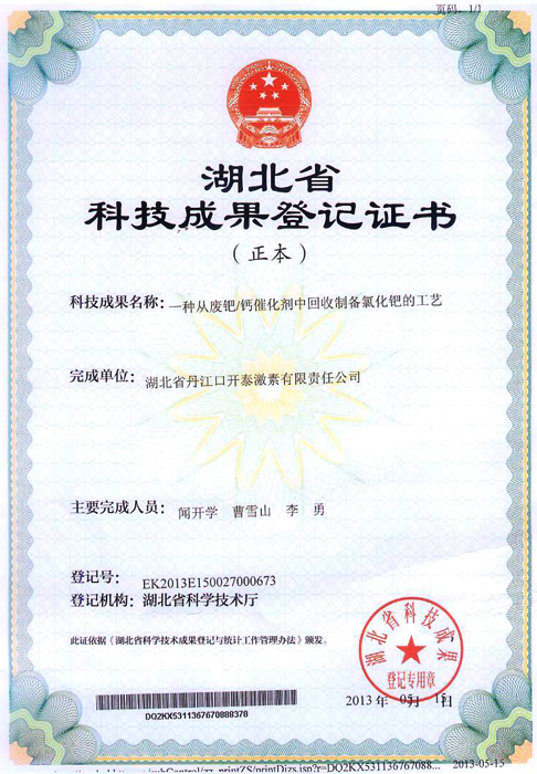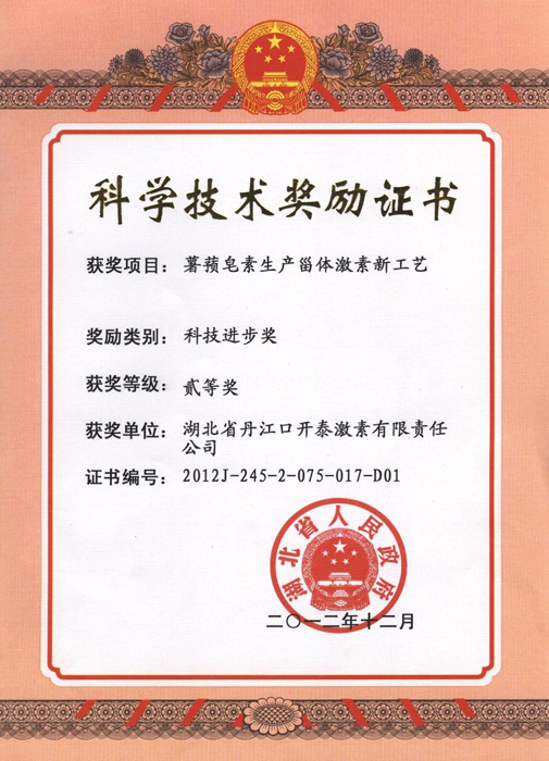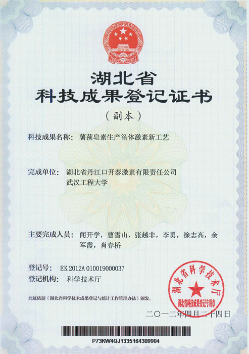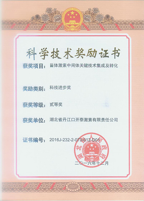 近三年公司承擔和實施國家、省、市重大科技項目22項,其中國家創(chuàng)新基金項目2項,湖北省重大科技成果項目3項,獲得國家發(fā)明專利3項,受理發(fā)明專利5項,企業(yè)取得的創(chuàng)新成果及成果轉化項目18項,開發(fā)“二高一優(yōu)”新產(chǎn)品10個,其中去氫表雄酮等4個產(chǎn)品已產(chǎn)業(yè)化。公司沃氏氧化物、去氫表雄酮、甲睪酮三種甾體激素中間體產(chǎn)品關鍵技術經(jīng)湖北省科技廳組織的技術成果鑒定,專家組一致認為三種產(chǎn)品的關鍵技術已達到國際先進水平,該成果已登記為“湖北省重大科技成果”,2012年該成果獲得“湖北省科技進步二等獎”;“甾體激素中間體關鍵技術及應用”2014年4月榮獲十堰市科學技術進步獎;“一種從廢鈀/鈣催化劑中回收制備氯化鈀的工藝”2015年5月榮獲十堰市科學技術進步二等獎;“用格氏反應試劑原科替代生產(chǎn)甲睪酮的方法”2016年元月榮獲十堰市科學技術進步二等獎;12月榮獲湖北省科學技術進步二等獎。